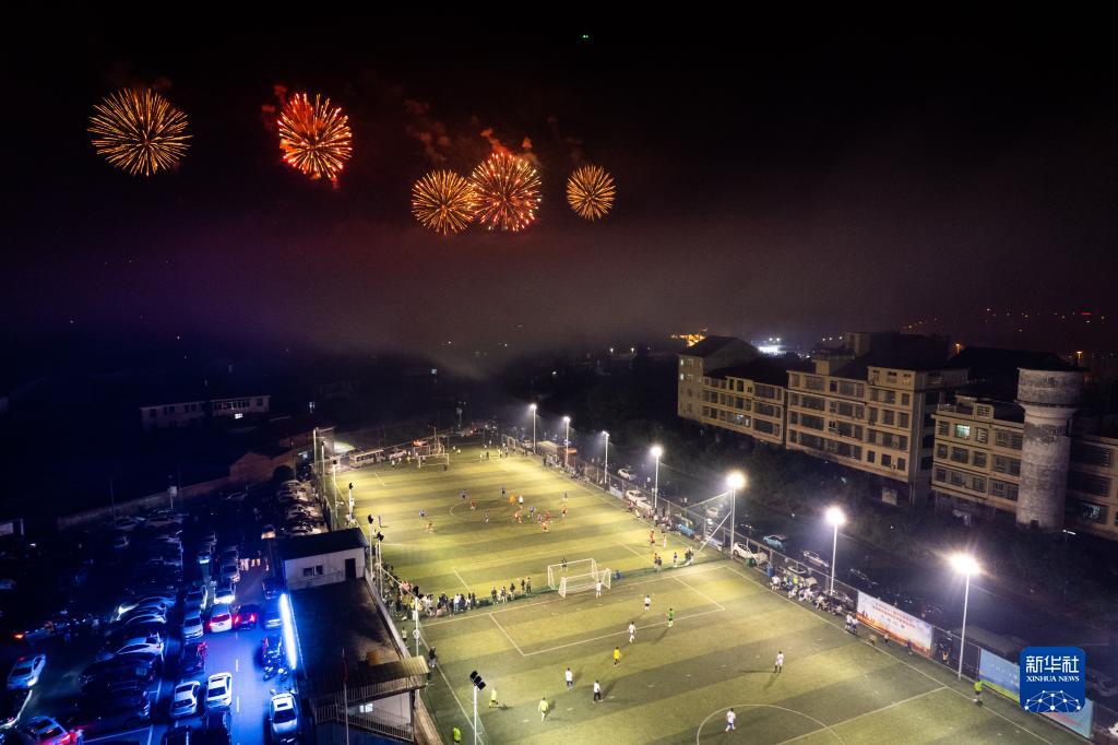 5月13日,市民在長(cháng)沙市瀏陽(yáng)市關(guān)口街道占佳社區的煙花足球場(chǎng)運動(dòng)(無(wú)人機照片)。