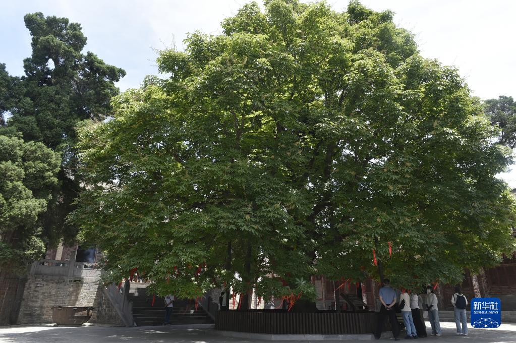 6月15日,游人在王屋山上參觀(guān)一棵古樹(shù)。