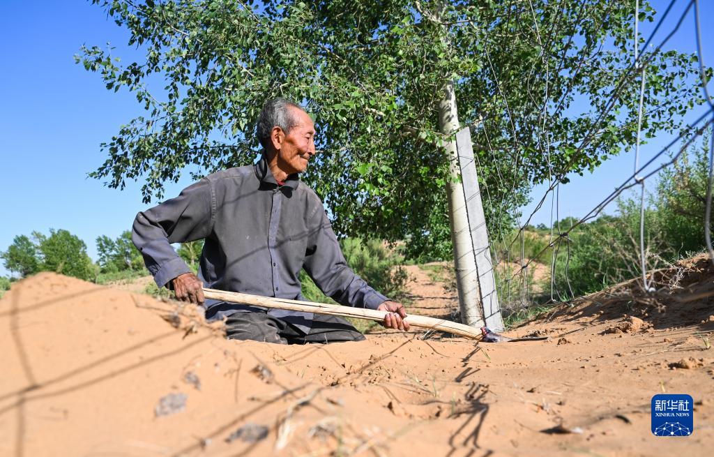 6月14日,曹扎娃在他的承包地邊界上鏟沙加固圍欄,防止牛羊進(jìn)入林地。