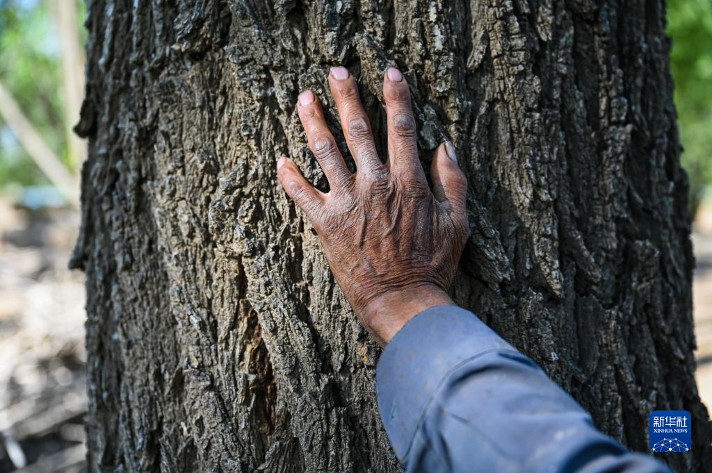 6月14日,曹扎娃撫摸一棵他親手種下的榆樹(shù)。