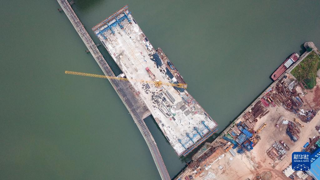 這是6月16日拍攝的香爐洲大橋項目建設現場(chǎng)(無(wú)人機照片)。