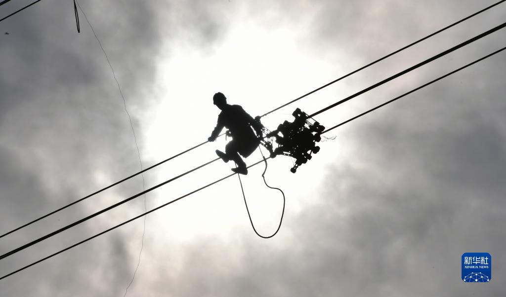 6月15日,在凌綏高速電力線(xiàn)路遷改工程現場(chǎng),國家電網(wǎng)遼寧朝陽(yáng)供電公司工程技術(shù)人員在安裝線(xiàn)上間隔棒。