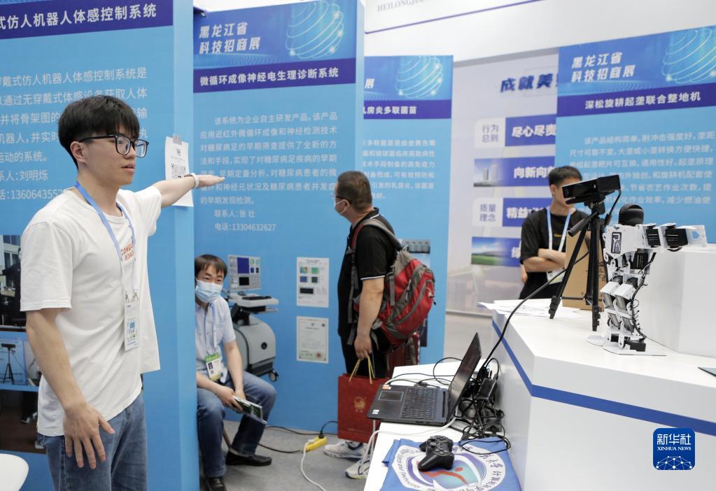 6月16日,參展商通過(guò)無(wú)穿戴式體感控制系統實(shí)時(shí)操控機器人執行動(dòng)作。