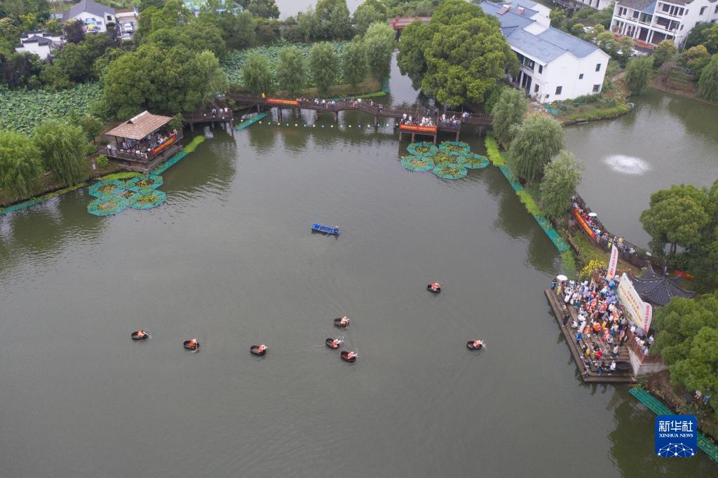 6月17日,村民們劃著(zhù)菱桶在水面上參加比賽(無(wú)人機照片)。