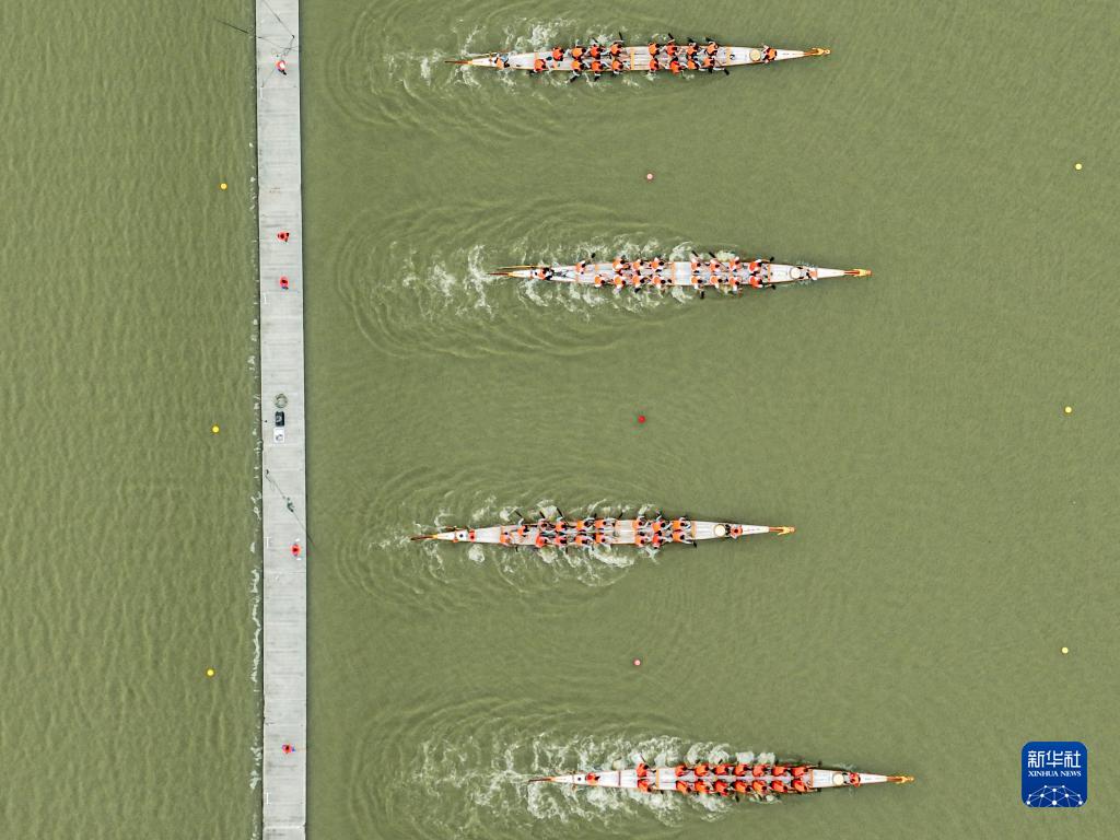 6月17日,在江蘇省宿遷市泗洪縣臨淮鎮水上運動(dòng)中心,人們參加龍舟競渡比賽(無(wú)人機照片)。