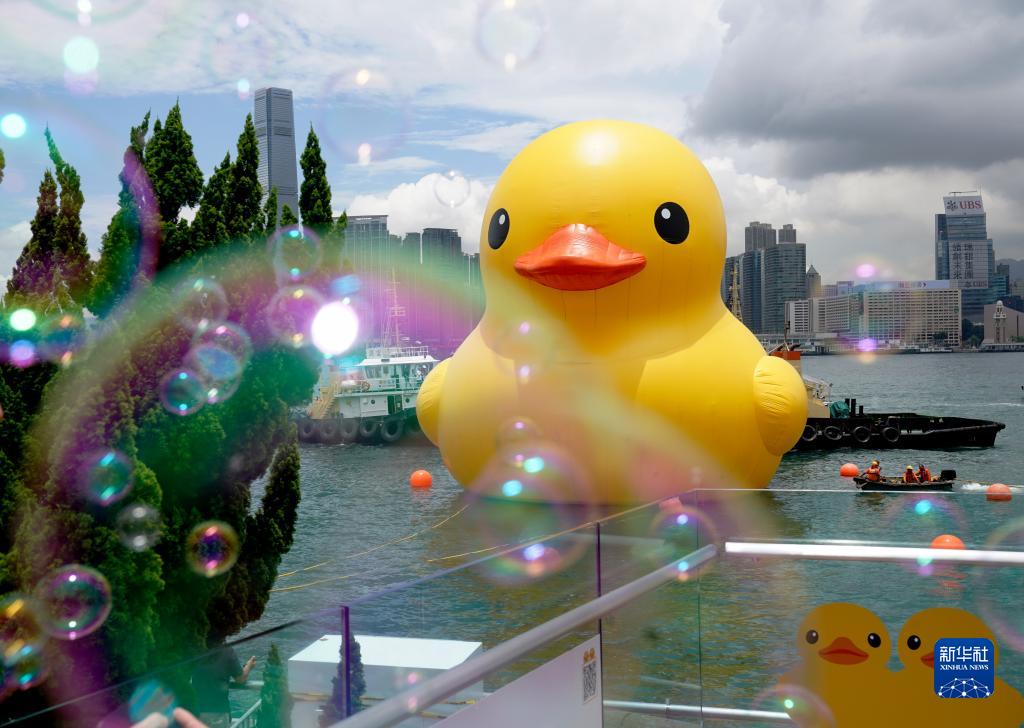 當日,兩只高約18米的“大黃鴨”亮相香港維多利亞港。這是闊別10年后,“大黃鴨”再度到港。
