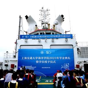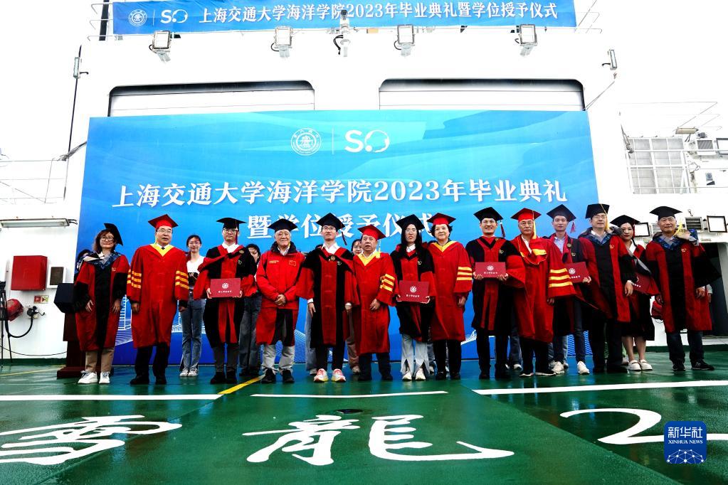 當日,上海交通大學(xué)海洋學(xué)院2023年畢業(yè)典禮暨學(xué)位授予儀式在“雪龍2”號上舉行,70余名畢業(yè)生在甲板上與師長(cháng)道別?!把?”號是我國自主建造的第一艘極地科學(xué)考察破冰船。