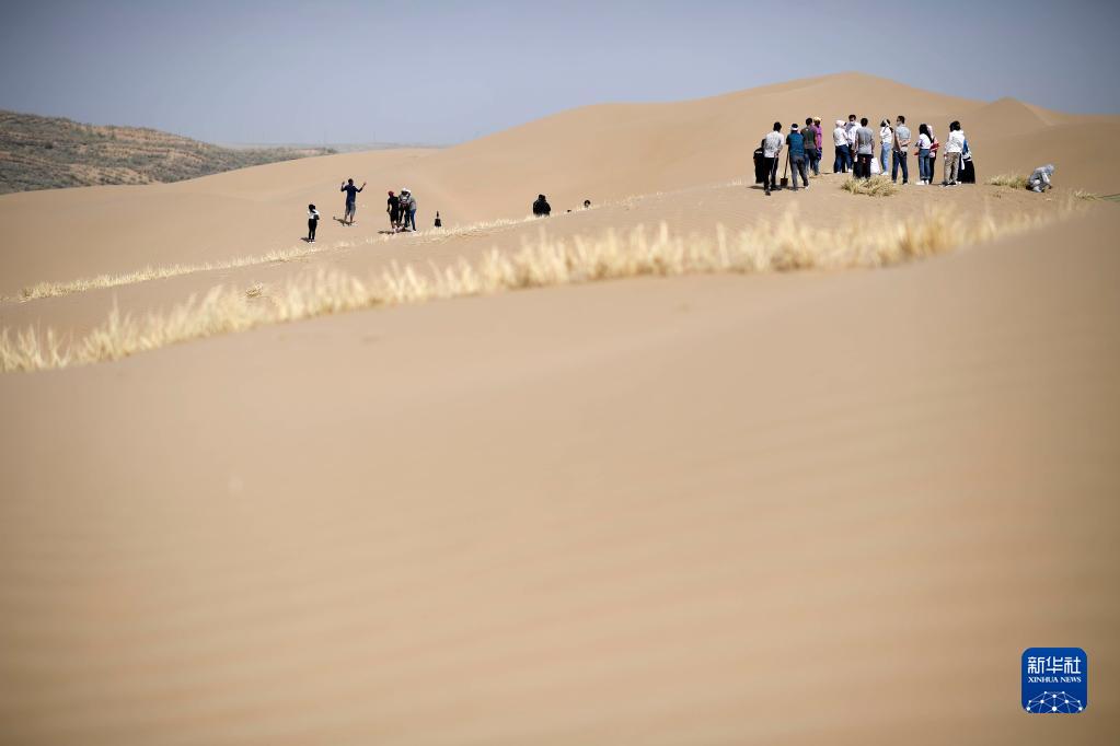6月16日,留學(xué)生在寧夏靈武市白芨灘國家級自然保護區扎草方格。