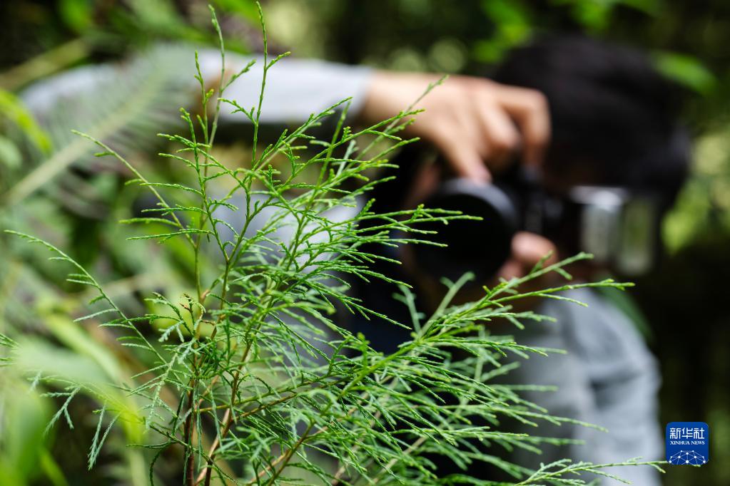 6月15日,中科院植物所博士生王孜在亞洲第一高樹(shù)旁拍攝一株西藏柏木的小樹(shù)苗。新華社記者 費茂華 攝