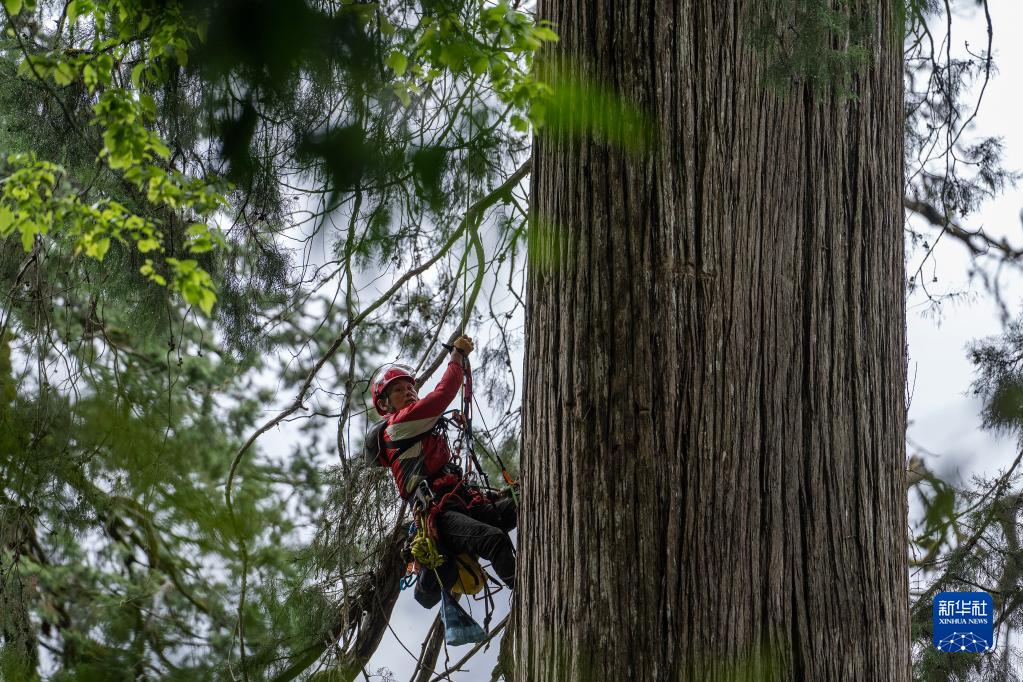6月15日,攀樹(shù)專(zhuān)家劉團璽在攀爬亞洲第一高樹(shù)。新華社記者 費茂華 攝