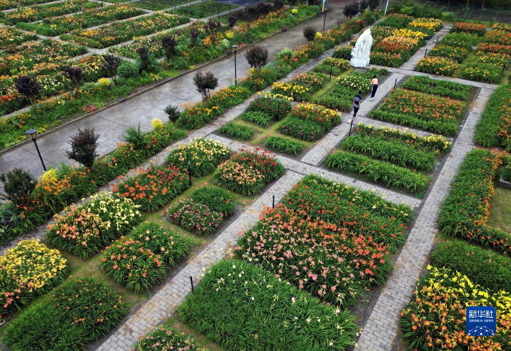 6月18日,人們在上海應用技術(shù)大學(xué)的植物園內參觀(guān)萱草花展(無(wú)人機照片)。