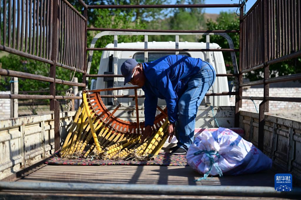 6月14日,額爾敦巴特爾將氈房的木制房頂裝車(chē)。