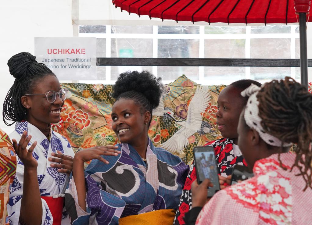 6月17日,在肯尼亞內羅畢,人們在內羅畢國際文化節的日本展位體驗傳統服飾。