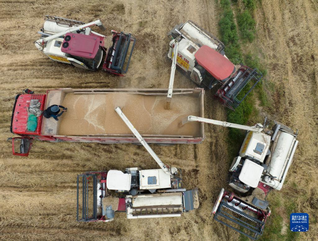 6月8日,長(cháng)豐農機專(zhuān)業(yè)合作社的收割機將收獲的小麥裝車(chē)。