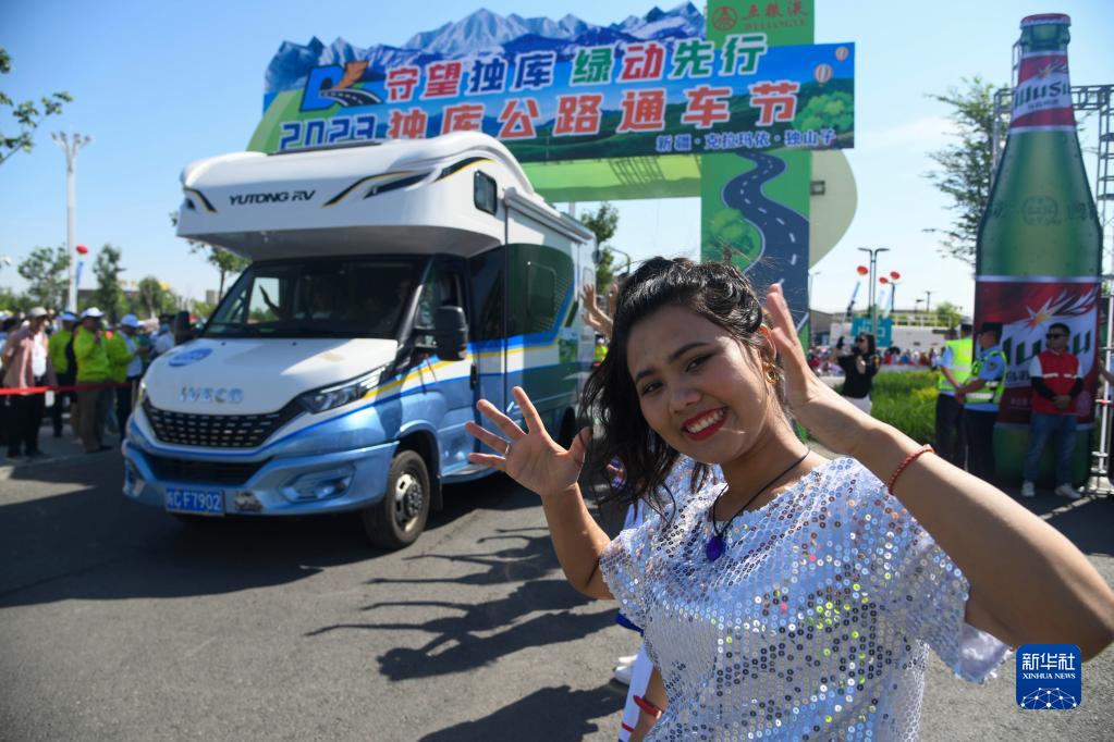 這是6月18日在新疆克拉瑪依市獨山子區獨庫大本營(yíng)廣場(chǎng)拍攝的獨庫公路通車(chē)節現場(chǎng)。
