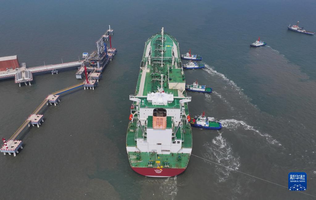6月18日,“莉亞”號輪在拖輪的協(xié)助下向河北唐山市曹妃甸新天LNG項目3號泊位靠泊(無(wú)人機照片)。