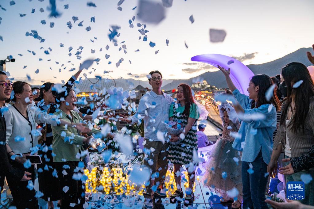 在八廓街附近的一家餐廳樓頂舉行的求婚儀式(6月7日攝)。
