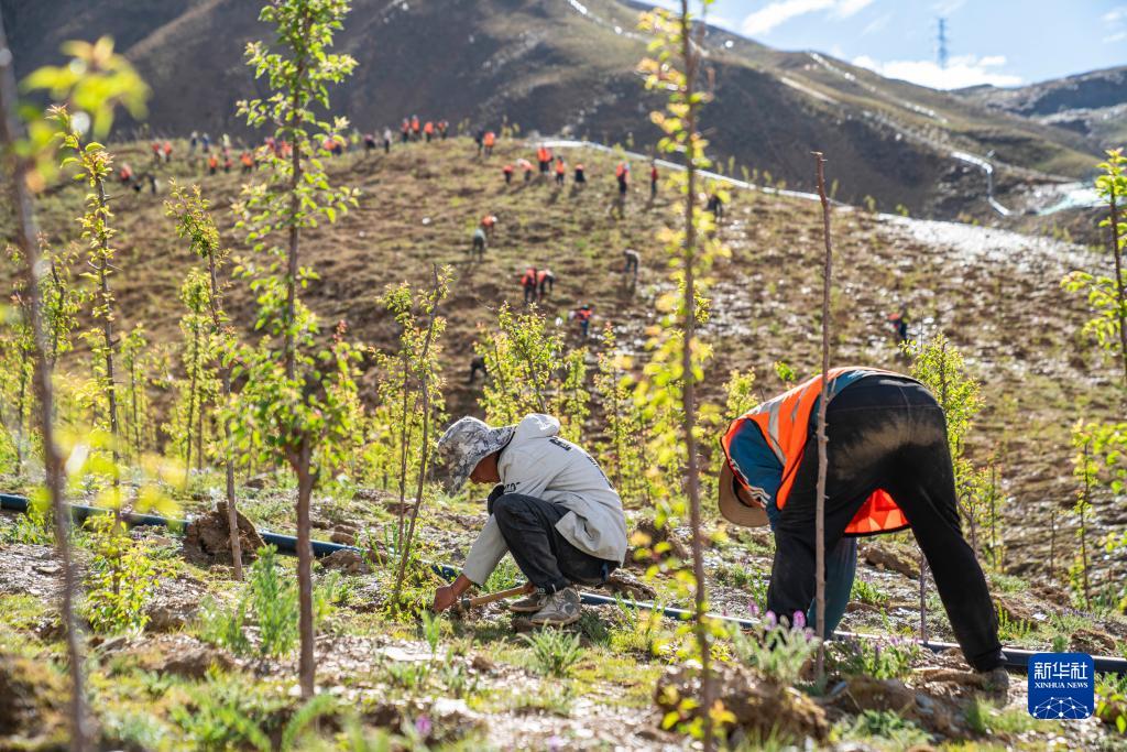 工人們在拉薩市城關(guān)區次角林村附近的山上播種造林(6月18日攝)。