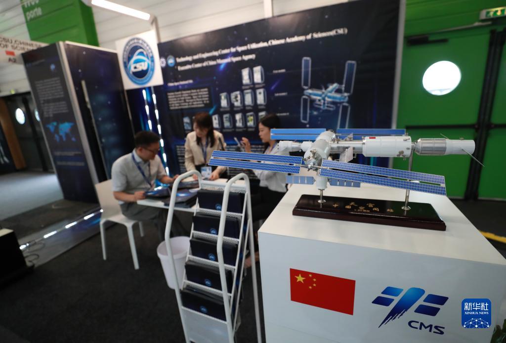 這是6月19日在法國巴黎近郊的布爾歇機場(chǎng)舉行的巴黎航展上拍攝的中國科學(xué)院空間應用工程與技術(shù)中心展臺。