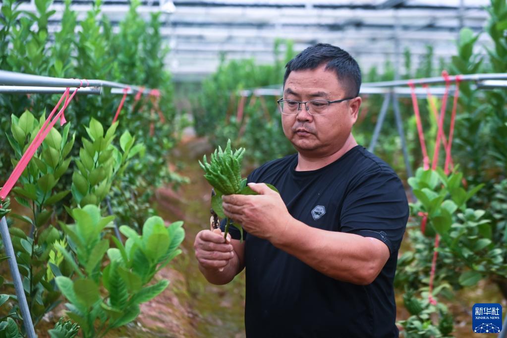 6月20日,在金華市金東區赤松鎮北山口村的佛手生態(tài)種植園內,種植戶(hù)葉小林在查看佛手青果的生長(cháng)情況。