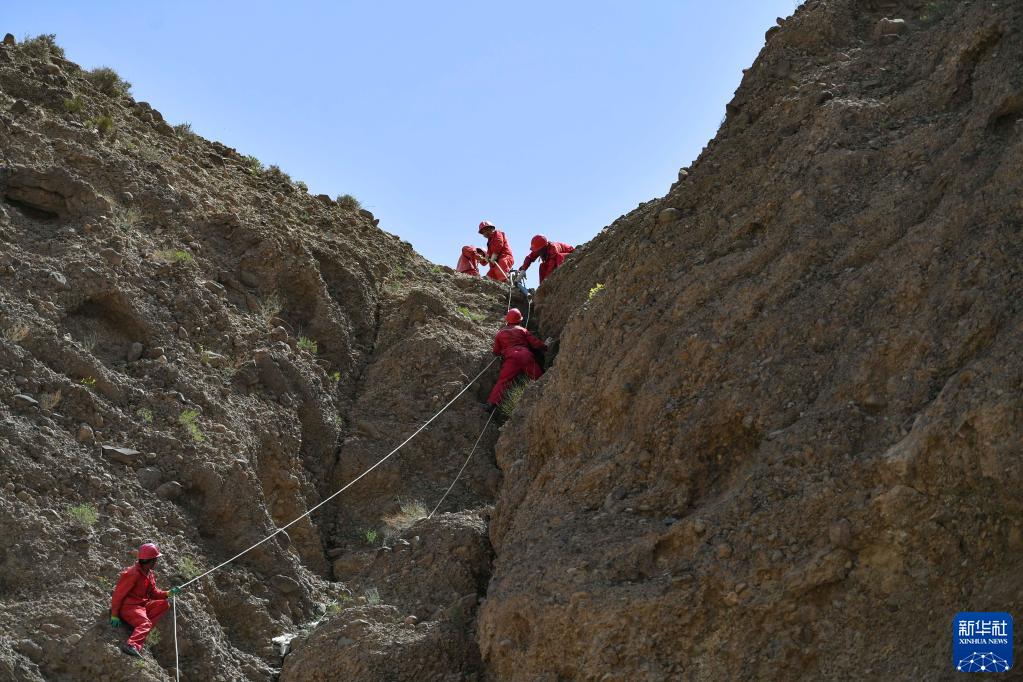 東方物探公司塔里木物探處2170隊的鉆工們借助繩索搬運鉆井設備,翻越一處落差約30米的崖壁(6月18日攝)。新華社記者 胡虎虎 攝
