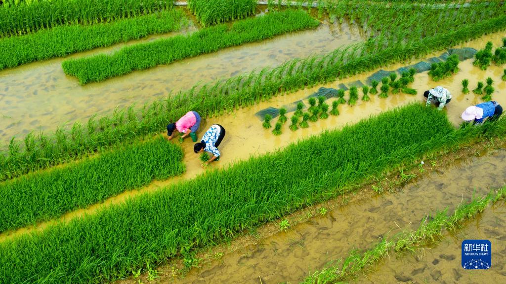 6月20日,在廣西靖西市新靖鎮其榮村,農民在起秧苗(無(wú)人機照片)。