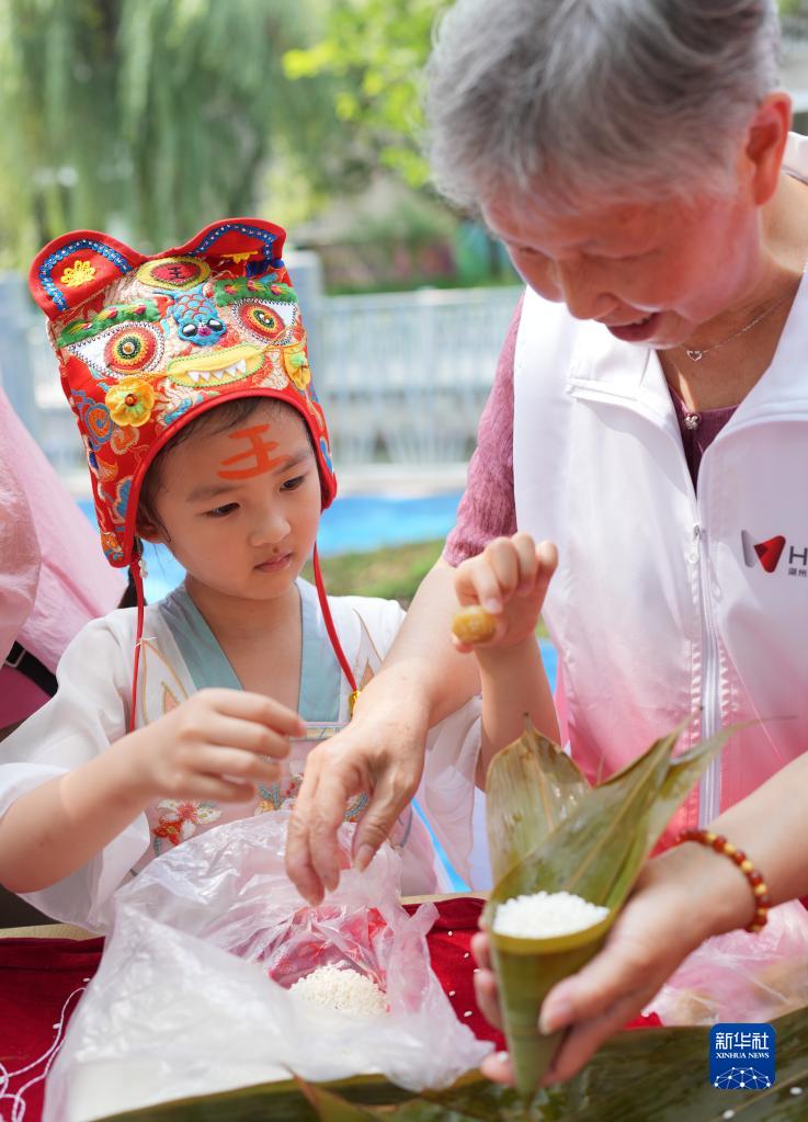 6月21日,一名兒童在活動(dòng)中向老人學(xué)包粽子。