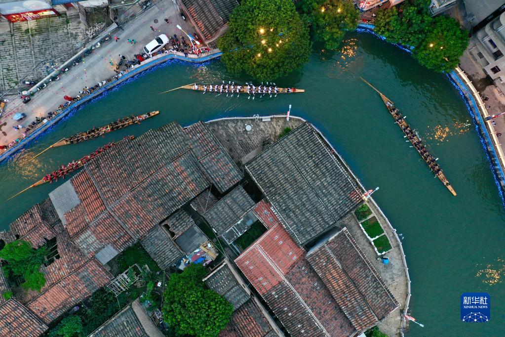 福州市長(cháng)樂(lè )區三溪村,龍舟在穿村而過(guò)的小溪中競渡迎端午(6月18日攝,無(wú)人機照片)。
