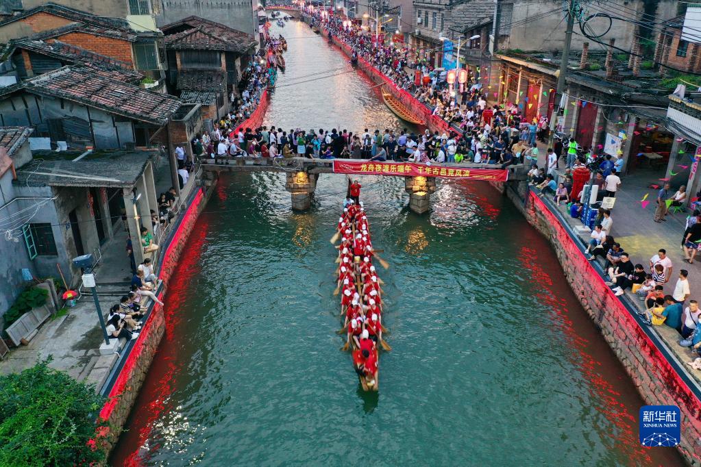 福州市長(cháng)樂(lè )區三溪村,龍舟在穿村而過(guò)的小溪中競渡迎端午(6月18日攝,無(wú)人機照片)。