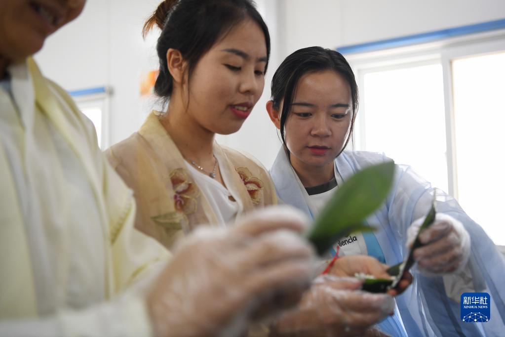 6月21日,中建三局的一線(xiàn)建設者在項目工地上包粽子。