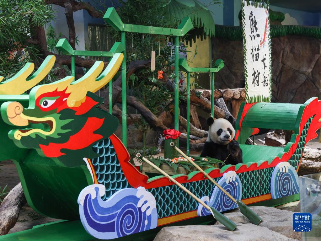 當日,廣州長(cháng)隆野生動(dòng)物世界熊貓館的10余只大熊貓迎來(lái)一個(gè)特別的端午節,它們與游客一起渡龍船、吃粽子,“體驗”一把端午文化的氛圍。