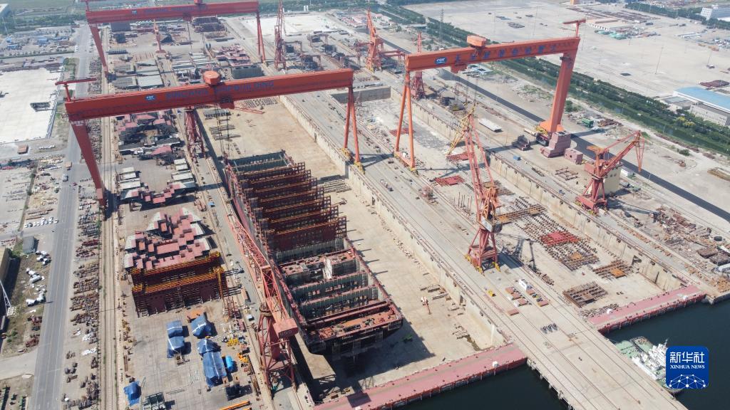 6月21日,在中船(天津)船舶制造有限公司廠(chǎng)區,船塢內正在建造一艘大型集裝箱船(無(wú)人機照片)。