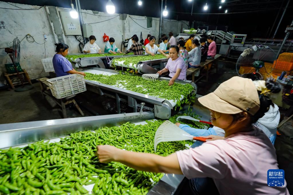 6月19日夜間,在四川省成都市金堂縣官倉綜合(果蔬)市場(chǎng)的流水線(xiàn)上,工人在篩選不符合外銷(xiāo)要求的毛豆。