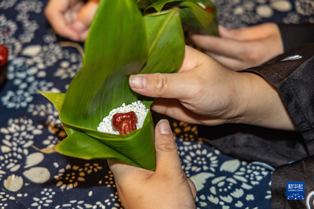 6月21日,在重慶市璧山區秀湖公園內的九門(mén)仙俠小鎮,游客在體驗包粽子。