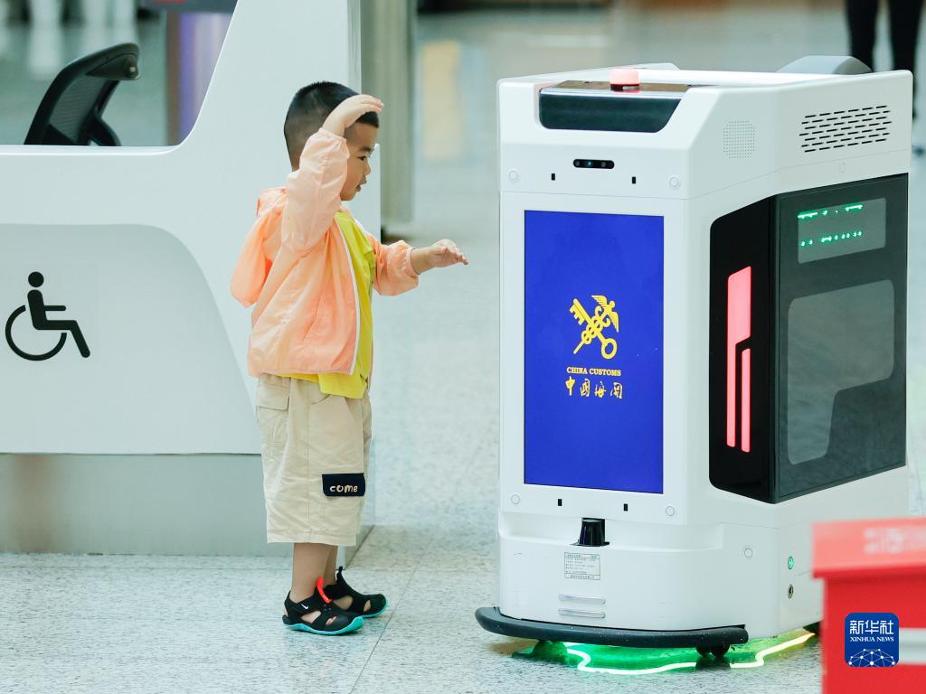 6月21日,在成都天府國際機場(chǎng),一名小旅客被手提行李智能攜運機器人所吸引。該機器人可以輔助海關(guān)關(guān)員封存、運輸異常行李,并引領(lǐng)異常行李旅客到達海關(guān)開(kāi)包間。