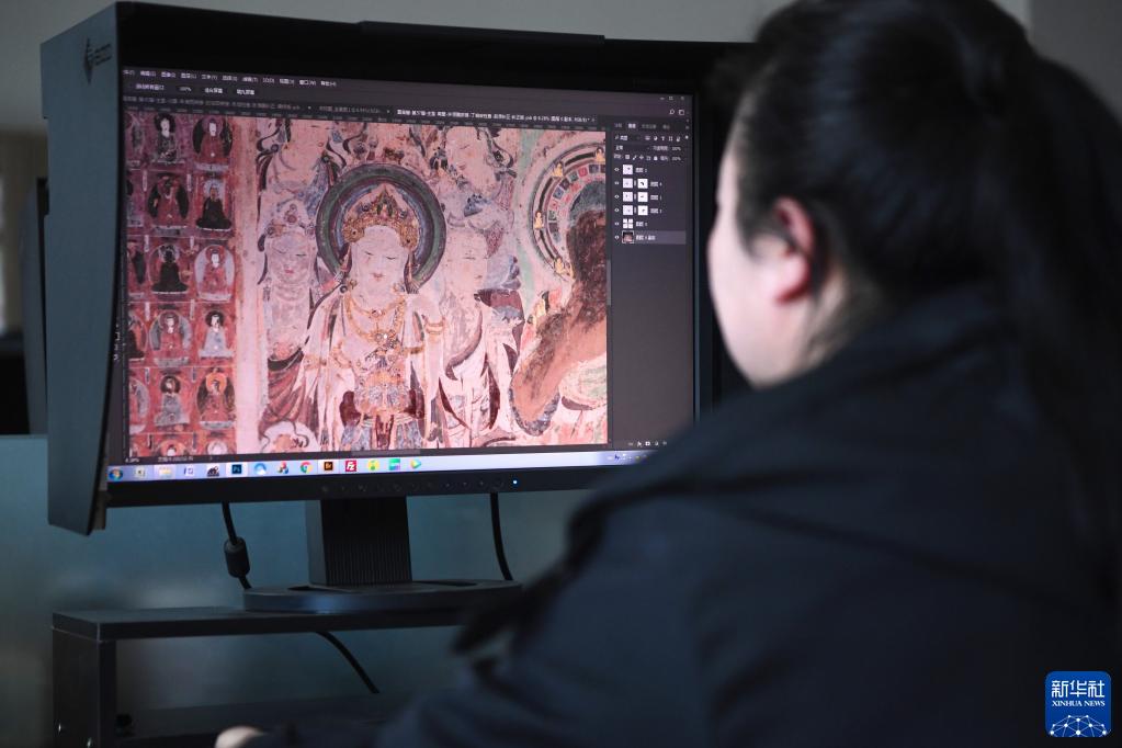 敦煌研究院文物數字化保護團隊圖像處理人員年海麗在拼接壁畫(huà)圖像(4月25日攝)。數字化探索為莫高窟的保護與傳承開(kāi)辟了全新路徑,數字技術(shù)讓敦煌文物走出洞窟,跨出國門(mén),走向“永久保存、永續利用”。