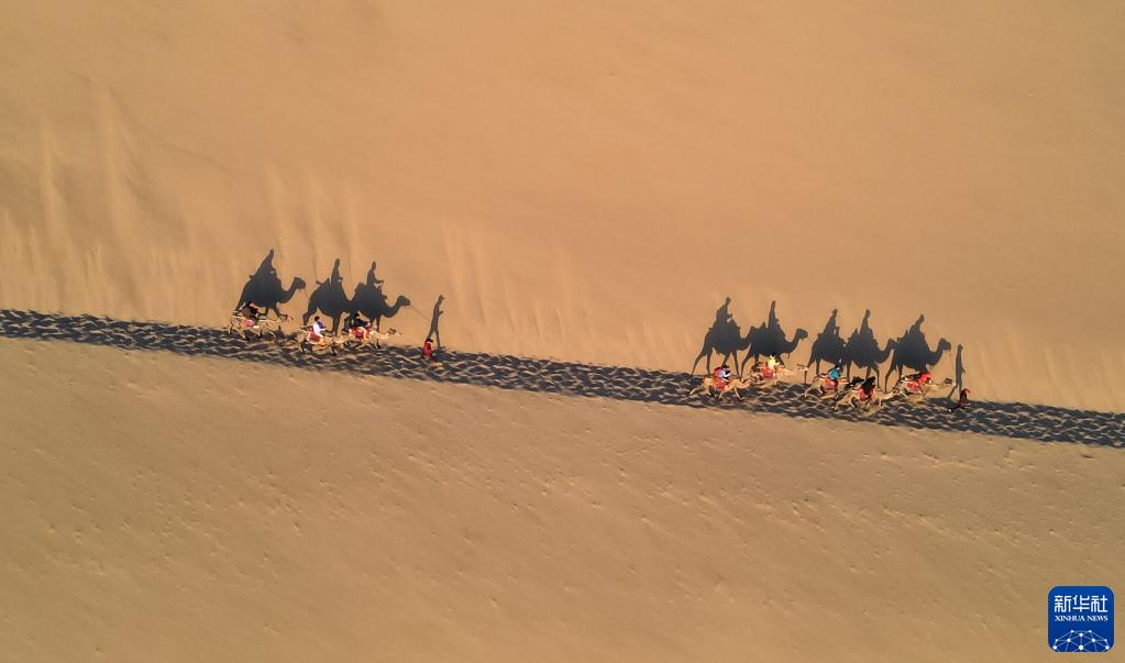 游客騎著(zhù)駱駝在敦煌鳴沙山月牙泉景區游覽(6月7日攝,無(wú)人機照片)。