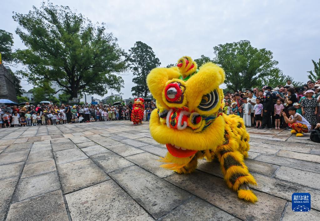 這是6月22日在浙江嘉興子城遺址公園廣場(chǎng)拍攝的舞獅表演。