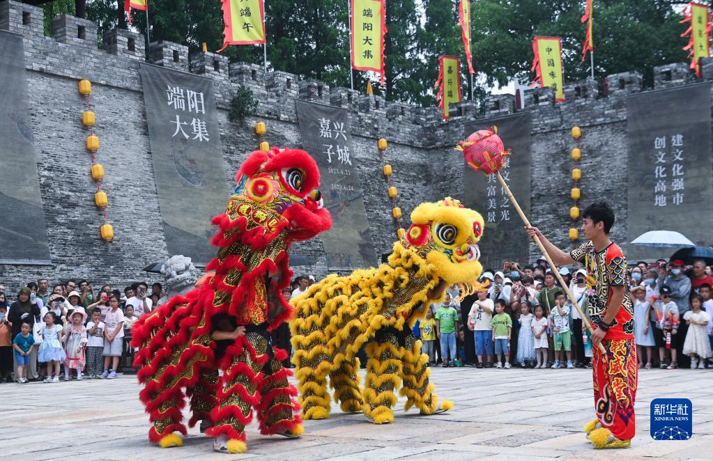 這是6月22日在浙江嘉興子城遺址公園廣場(chǎng)拍攝的舞獅表演。