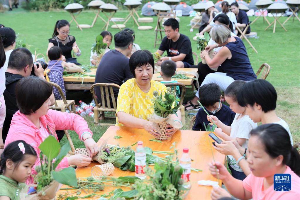 6月22日,人們在上海市閔行區華漕鎮舉行的端午活動(dòng)上制作艾草小提籃。