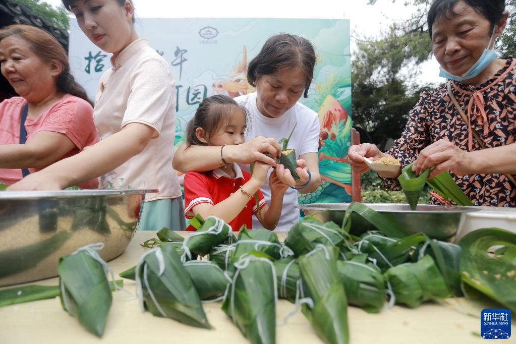6月22日,在江蘇省揚州市何園景區,小朋友在社區志愿者的幫助下學(xué)習包粽子。
