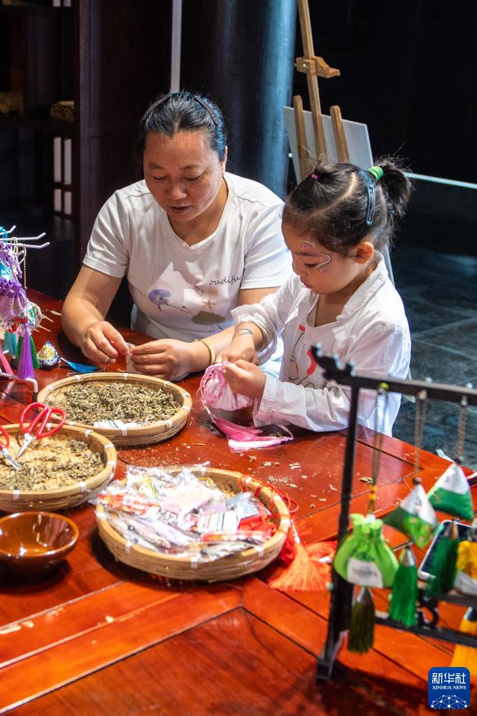 6月22日,游客在湖南省岳陽(yáng)市汨羅市屈子祠鎮屈子文化園制作香囊。