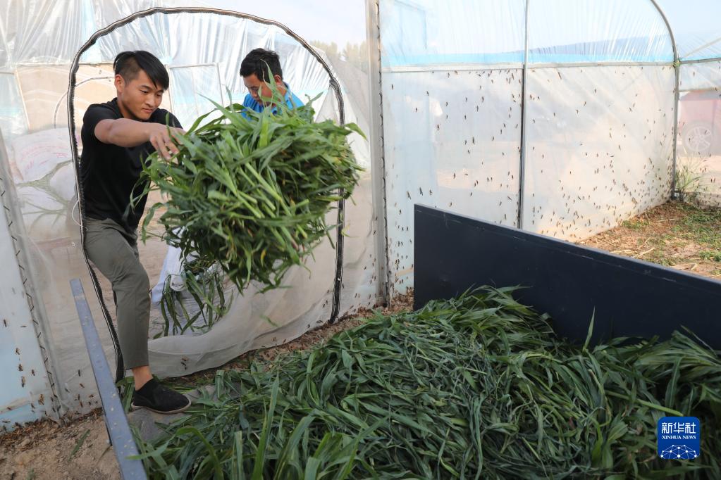 6月21日,山東省樂(lè )陵市西段鄉岔河村東亞飛蝗養殖基地的養殖戶(hù)用玉米草喂螞蚱。