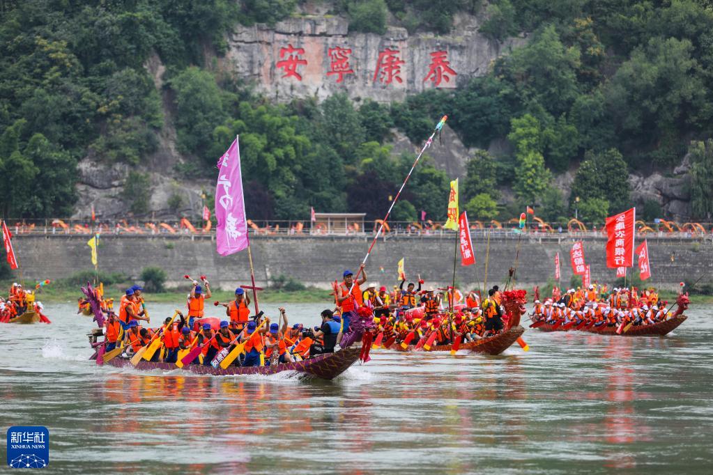 6月22日,第二十三屆中國安康漢江龍舟節開(kāi)幕,28支當地參賽隊伍在漢江上表演龍舟競渡,喜迎端午佳節。