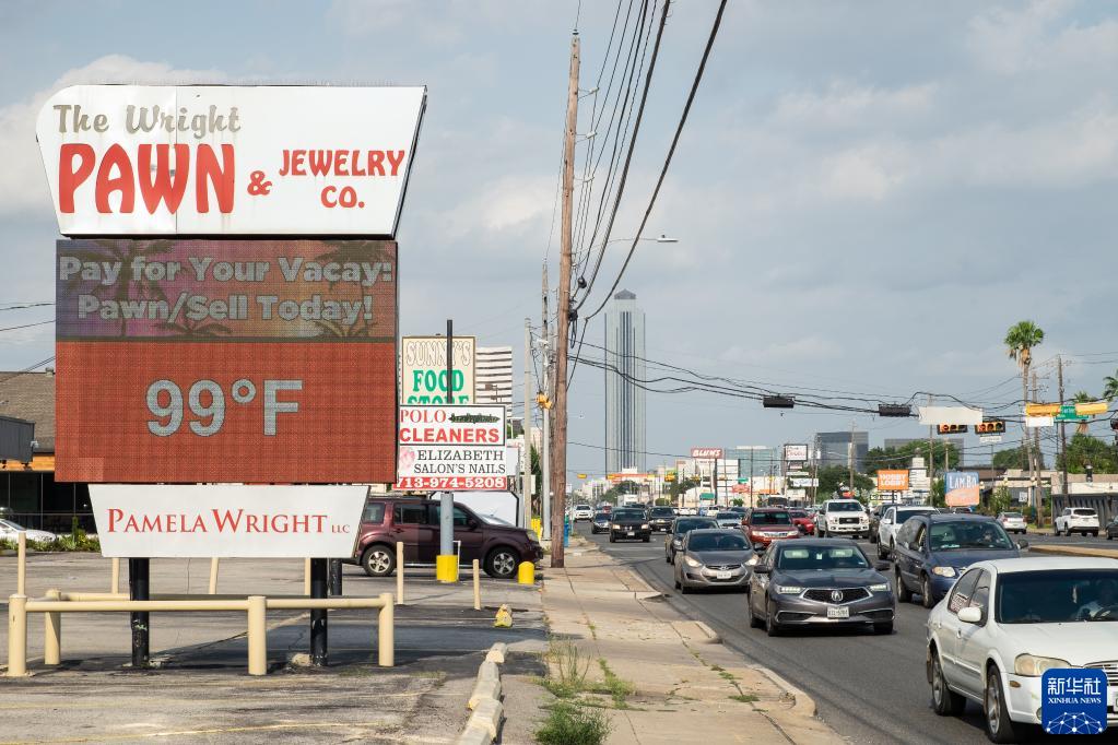 6月21日,美國得克薩斯州休斯敦市一個(gè)溫度指示牌顯示氣溫達到99華氏度(約37.2攝氏度)。