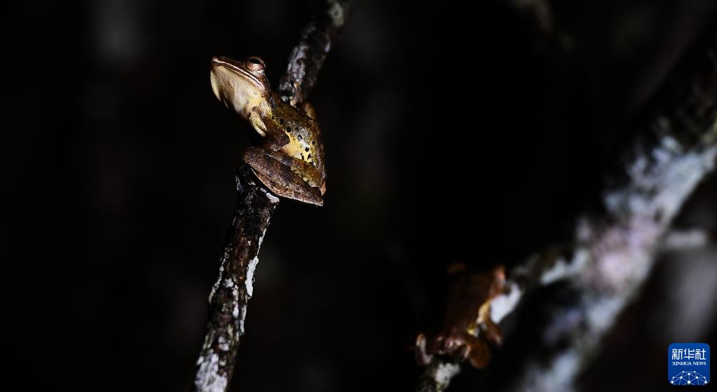 在海南熱帶雨林國家公園吊羅山片區,無(wú)聲囊泛樹(shù)蛙在樹(shù)上休息(6月13日攝)。