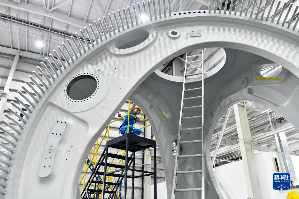 6月21日,在乳山市遠景能源零碳產(chǎn)業(yè)園,工作人員在風(fēng)機輪轂前作業(yè)。