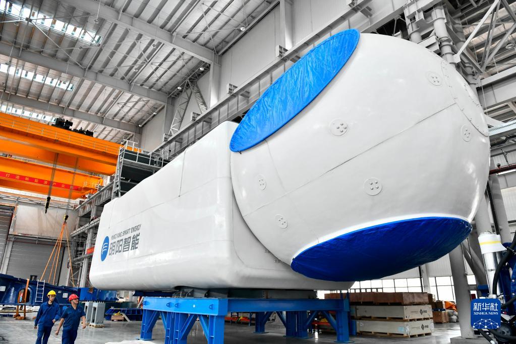 6月21日,在明陽(yáng)北方(乳山)高端海洋裝備智能制造產(chǎn)業(yè)基地,工作人員從首臺下線(xiàn)的10兆瓦級風(fēng)機前經(jīng)過(guò)。