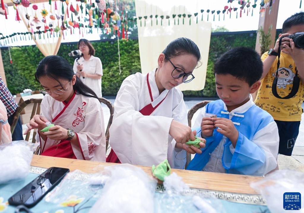 6月22日,孩子們在嘉興端午民俗文化節的端陽(yáng)大集上學(xué)習做香囊。