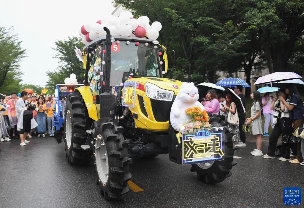 當日,為迎接畢業(yè)季,華中農業(yè)大學(xué)舉行了一場(chǎng)花車(chē)巡游,學(xué)生們簇擁著(zhù)由現代農機裝備組成的花車(chē)隊伍,在校園里巡游,慶祝畢業(yè)、致敬青春。